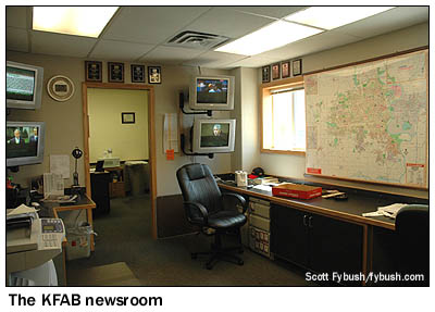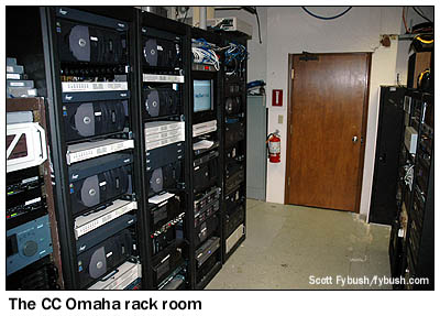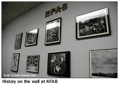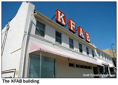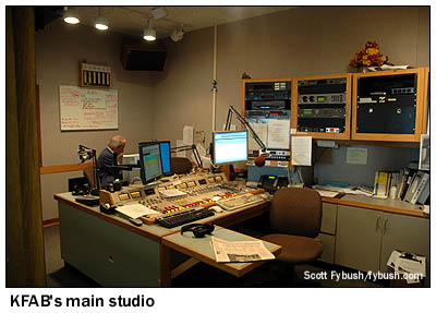 KFAB came to this building when it moved from Lincoln to Omaha in 1948, and it's just kept growing over the nearly six decades since then. Today, five Clear Channel stations are located here: KFAB (1110 Omaha), with its news-talk format; oldies KGOR (99.9 Omaha), the erstwhile KFAB-FM; country "Kat" KXKT (103.7 Glenwood IA); classic country "US 93" KHUS (93.3 Bennington) and classic rock "Brew" KQBW (96.1 Omaha). Their studios are arranged in the original second-floor KFAB space, forming a horseshoe around a technical core that used to be a big performance studio for KFAB, back in the day.