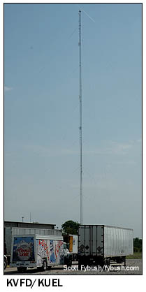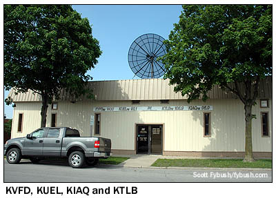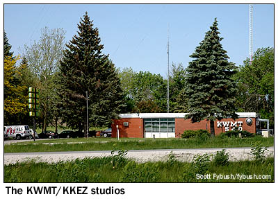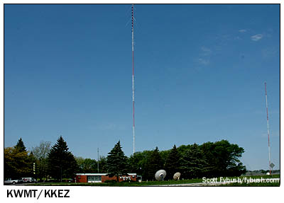 It's only 15 minutes or so west along US 20 to Fort Dodge, the biggest community we'll pass through until we get to Omaha this afternoon, and while we'd been to this city on our 2001 Big Trip, there's plenty that's changed since then. We never saw the studios of oldies KVFD (1400 Fort Dodge) and AC KUEL (92.1 Fort Dodge) back then, and now those two signals have some company: their former owner, Sorensen, sold the stations to Three Eagles Media a few years ago, and now Three Eagles' country KIAQ (96.9 Clarion) and oldies KTLB (105.9 Twin Lakes) call this studio building home as well. (Their old studios a couple of blocks away still have the sign up, which confused us for a moment!) Downtown Fort Dodge slopes west down to the Des Moines River, and it's on the west side of the river that we find the transmitter sites for the two AMs in town. KVFD and KUEL share a skinny tower tucked behind a beer distributor's warehouse on the southwestern edge of town, just off US 169 as it heads south toward Boone and Ames. They're not the star attraction where Fort Dodge towers are concerned, though - that's about a mile to the north on 169, just north of the intersection with business US 20. We'd seen the studio/transmitter site of classic country KWMT (540 Fort Dodge)/hot AC "Mix" KKEZ (94.5 Fort Dodge) site on the 2001 trip, but things have changed rather dramatically out here on A Street since then. In 2002, vandals toppled the 637-foot main tower here, briefly silencing KKEZ and reducing KWMT from its usual booming 5000-watt AM signal (which, thanks to the combination of a low dial position and amazing ground conductivity, covers most of the state by day) until a replacement tower could be built. That tower went up quickly, and once again towers impressively over the west side of Fort Dodge. Back down at ground level, change is afoot, too: just a few months after our stop, Clear Channel sold KWMT and KKEZ to Three Eagles, thus giving that company close to a monopoly on Fort Dodge radio. (More studio moves to come? We'll see...)