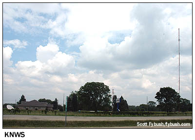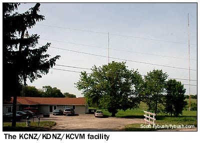 One more note from the 2007 ice storm: it took down an FM tower out here. Public radio KHKE (89.5) had its tower off Iowa 21 south of Waterloo (on the way down to Dysart, if one were going that way), and it hadn't yet rebuilt when we were in town in May, instead operating at low power from the University of Northern Iowa campus. Two other FM towers could still be found south of Waterloo when we came back through the city once more on Tuesday afternoon to finish up our tour. Just south of the US 20 bypass on the southern edge of town sits the stick of KOEL-FM (98.5 Waterloo), and a few miles south of that, off US 63 near Hudson, we find the tower of KCVM (96.1 Hudson) and expanded-band KCNZ (1650 Cedar Falls), whose studios we had seen the previous day. From here, we circle back on the US 20 bypass to the east side of town, where all of the remaining Waterloo transmitter sites are to be found. First up, on a hill east of Waterloo along Independence Avenue, is the old studio site of KXEL, a building that's now vacant except for an auxiliary transmitter for KOKZ (105.7).