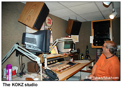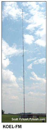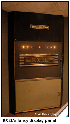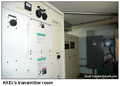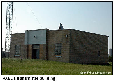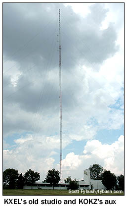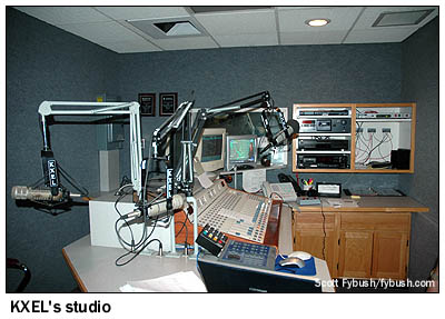 KXEL, the news-talker in the group, anchors one end of the hallway, with a most unusual object in the corner: one panel of the old Westinghouse HG-50 transmitter that was removed from service has been installed as a display here, complete with the Westinghouse nameplate and the call letters. The lights are purely for show, but it sure does look nifty! The other AM, "Star 1330" KWLO, runs mostly automated, but a small studio down the hall is used for its live noontime show and production. (Before this signal was KWLO, it was KWWL's AM outlet.) There are two FMs here, too. KFMW (107.9 Waterloo) is a hard rocker, and its studios have an unusual stand-up configuration with a console mounted in an island in the center of the room. Just down the hall, oldies KOKZ (105.7 Waterloo), the historic FM partner of KXEL, occupies a more conventional studio setup. There's also an interesting story about how we came into contact with Mark Schumacher here at KXEL, and it all has to do with a nasty ice storm the previous winter that left much of this area without power. KXEL itself was especially hard-hit, losing power at its transmitter site for over a week and shifting its programming over to sister station KWLO in the interim. Somewhere along the way, one of the DX clubs got in contact with Mark to find out what was going on - and he asked if the club contact knew anything about the picture of KXEL's transmitter site that had appeared here on Site of the Week way back in 2001, when we recapped our Big Trip of that year. Mark took a great deal of pride in the work he'd done since then to upgrade and clean up the transmitter site, and he was hoping it might be possible to get some newer pictures of KXEL up here on Tower Site of the Week - and we, of course, were more than happy to arrange for a visit!