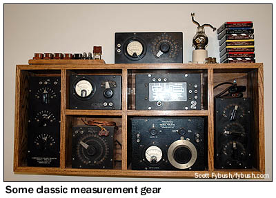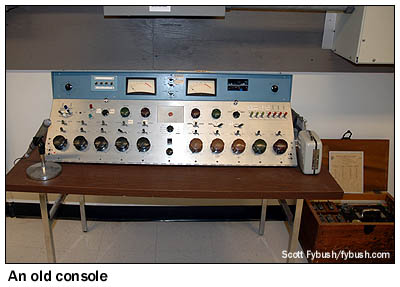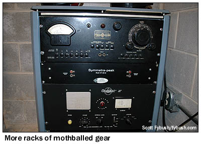 But WTMJ, with the attention it's always paid to its long history, decided to do something more with this new space than just install its relatively sterile new equipment. Over the years, its engineers have filled corners of the room (and the tops of several of the racks!) with artifacts from more than eight decades of WTMJ radio and television. There are classic microphones, not just the expected RCA 77s and 44s, but also some even more ancient examples. There's vintage measurement and test gear (most of what's in the rack shown above came from General Radio in Cambridge, Mass., probably in the thirties from the looks of it), old WTMJ-TV studio and field cameras, and even (not shown here) what may be one of the last intact editing setups for 2" videotape, which was edited by coating the tape with iron filings to make the magnetic patterns visible, then peering through a microscope to carefully cut the tape and reassemble it along frame lines. It still didn't work very well!