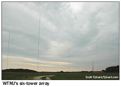 ![]() January 25, 2008 WTMJ 620, MilwaukeeIt's a new year here at Tower Site of the Week, and a new set of travel pictures to start us off. In August 2007, your editor and Mrs. Editor spent a few days traveling from her native Fort Wayne to Chicago, Milwaukee, Madison and then back to Fort Wayne via Rockford, Illinois, and along the way we had a chance to see some very significant broadcast sites. One big goal of the trip was to pick up some loose ends from one of the more enjoyable stops we've made in recent years. Our 2005 Big Trip (featured here on Site of the Week in two installments, here and here, in 2006, and subsequently in a later piece for Radio World, where we used to have a column) included about a day and a half in Milwaukee, which was not nearly enough time to see all the broadcast history that the Brew City had to offer. And even though the main purpose of our Milwaukee stop this time wasn't radio-related, we still managed to work in a few of the sites we'd missed the last time out. First, foremost and southernmost is this week's featured site: the six-tower facility of WTMJ (620 Milwaukee), erected in 1995 when the station left its longtime (1927!) tower site in Brookfield, west of Milwaukee and became one of the first regional-channel stations to increase power above the old 5 kW limit.