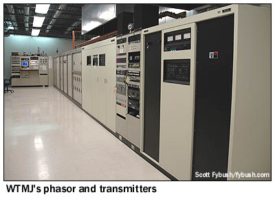With the lifting of the old power restrictions, WTMJ was able to increase power to 50 kW by day and 10 kW by night - but it couldn't do so from the Brookfield site. Instead, it had to move south of Milwaukee, aiming most of its new power north, and that meant a new location some 20 miles south of downtown Milwaukee, just off US 45 near Union Grove in Racine County, Wisconsin. Six 314' towers, broadly spaced, went up in what I believe is a cabbage field, with all six towers being used at night and four of the six being used by day. The combination of high power, a low dial position and a potent directional pattern gave the new WTMJ signal a reach all the way north to Green Bay with close to a city-grade signal day and night (a good thing for the flagship station of the Packers network!), and a pretty respectable signal west to Madison and south to the northern Chicago signals by day as well. Inside the new building, there's plenty of space for everything this big AM signal needs: the big phasor for the day and night signals, the main Harris DX50, the backup DX10, and several racks of STL and processing gear, as well as separate rooms for an engineering office and a generator.
