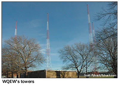 ![]() March 21, 2008 WQEW 1560, New YorkIn this week's installment of Tower Site of the Week, we finally complete our collection of the city's 50,000-watt AMs. In earlier installments of the series, we've visited WFAN/WCBS, WOR (and WOR again, and again), WABC, WINS, WEPN and WBBR. But up at the top of the dial, at 1560, there's one more 50,000-watt signal. Today, it's Radio Disney outlet WQEW - but this venerable station has a long history that goes back to, of all things, an early experimental television station! Early, in this case, is 1929, when John V.L. Hogan was granted an experimental license, W2XR, to transmit mechanically-scanned television pictures up in the shortwave region (2100 kHz and above). The TV experiments lasted only a few years, but in 1933 Hogan began to accompany his television images with classical music transmitted on a special "high-fidelity" AM band just above the regular broadcast band, which then ended at 1500 kilocycles. W2XR's music broadcasts were aired over a 20 kHz-wide channel at 1550 kc, and its regular schedule, which started in 1934, soon drew an enthusiastic following among fans of high-quality music.