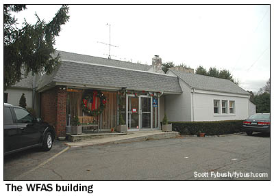 In its new White Plains home, WFAS was an immediate success, even though it wasn't a full-time operation. First on 1210, then on 1240 after the NARBA frequency shifts of 1941, the 250-watt signal had to share its frequency with Long Island's WGBB in Freeport. It wasn't until March 27, 1943 that WFAS finally won full-time authorization by sliding down the dial one notch to 1230, where it's been ever since. In 1947, WFAS traded its short tower on the roof of the Roger Smith Hotel for the present transmitter site in Greenburgh, building the small transmitter shack that survives today at one end of the current WFAS building. (Look carefully at the right side of the building to see the original structure.) 1947 also saw the debut of WFAS-FM, initially as a full-time simulcast of the AM signal. Seven years later, WFAS moved its studios from the Roger Smith out to the Secor Road site, building the first of what would be several additions to the original 1947 structure.