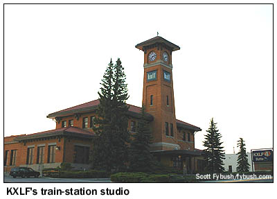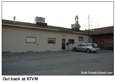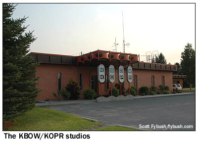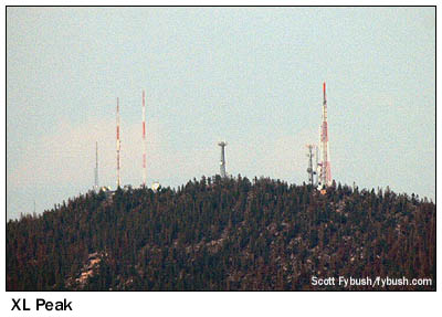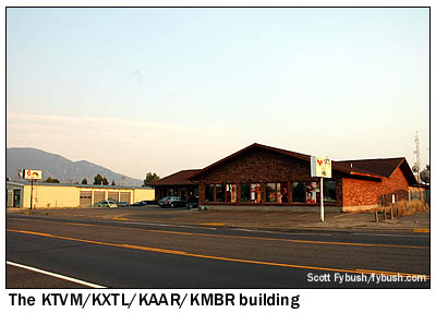 Heading back into town from the 550 site, we find a significant chunk of Butte broadcasting lined up along just two blocks of Dewey Boulevard on the city's south side. The studios for KBOW and its FM sister, KOPR (94.1, picking up the calls of the old AM 550) sit at 660 Dewey Boulevard, almost next door to an office building that's home to three radio stations and a TV station. KXTL (1370), KAAR (92.5) and KMBR (95.5) occupy the front of the building, and around back is the small studio of NBC affiliate KTVM (Channel 6), a semi-satellite of Missoula's KECI (Channel 13). From here, we can look up into the mountains east of Butte for a telephoto shot of "XL Peak," whose towers are home to all of the city's TV signals and all the FMs lined up here on Dewey.