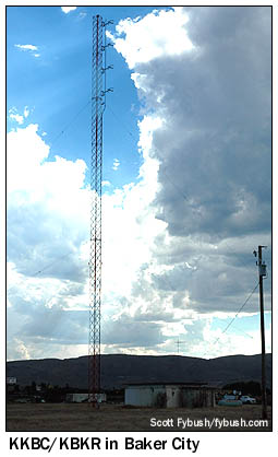 (He's even got his very own website - check it out at bobbyd.com!) Two of the stations operating out of this cluster - news-talk KBKR and oldies KKBC - can't really be heard very well in La Grande. That's because they're licensed to Baker, 40-odd miles over a mountain range to the southeast, and after saying farewell to Bobby, our next stop is at the tower they share on Sunset Lane, just off the side of I-84 near the downtown Baker City exit. No, there's no fence around the base of that tower, nor does there need to be - the AM side of this operation is a shunt-fed antenna, though it's hard to see in this picture as the sun emerges from the clouds behind the tower. It's another 70 miles down the emptiness of I-84 to our last Oregon destination, the city of Ontario on the banks of the Snake River, right on the eastern edge of the state. We're in Mountain Time now, and in the Boise TV market, too. (Remarkably, La Grande and Baker are part of the Portland TV market, even though it's well over 200 miles away. The only local TV signals in town are Oregon Public Broadcasting's KTVR 13 and Fisher's KUNP 16, which exists only to force cable systems in Portland to carry its LPTV relay there, KUNP-LP 47, the local Univision affiliate.)