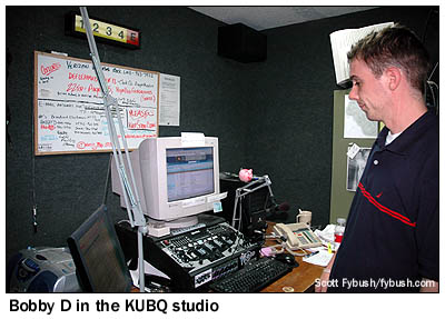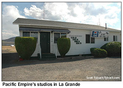 Just east of downtown, 2510 Cove Avenue is the transmitter site for news-talk KLBM (1450 La Grande) and the studio site for KLBM itself and its Pacific Empire Communications sister stations: simulcaster KBKR (1490 Baker), oldies KKBC-FM (95.3 Baker), classic rock KUBQ (98.7 La Grande) and oldies KRJT (105.9 Elgin). With many more hours of driving ahead of us - 180 miles or so down I-84 to Boise, not to mention "losing" an hour as we return to Mountain Time, plus a deadline of sorts to meet in Boise - we're about to get back in the car after snapping a few quick shots of the Pacific Empire building when we see someone come out the door to see what we're up to. After a quick explanation, we're invited inside for a tour, where we learn that our new friend is Bobby D, program director for the cluster and afternoon host on KUBQ.