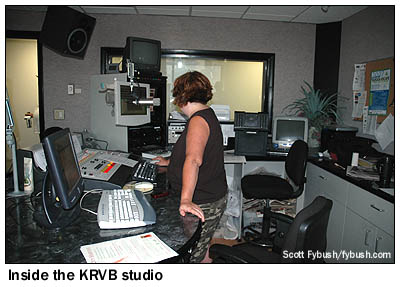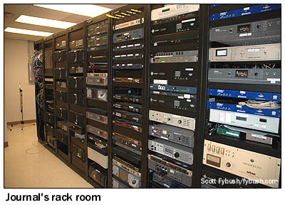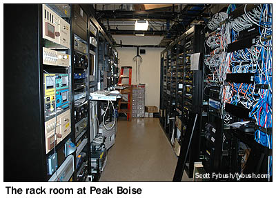 Right next door to KTVB, at 5257 W. Fairview, is the "Plaza Seven" office building (named for the TV station next door, we assume), and it's there, a day later, that engineer Rockwell "Rocky" Smith gives our group a tour of the Journal Broadcast Group radio stations that occupy most of the second floor. The cluster includes two AMs - oldies KGEM (1140 Boise) and standards KCID (1490 Caldwell) - and four FMs - AAA "River" KRVB (94.9 Nampa), modern rock "X" KQXR (100.3 Payette), classic rock "J105" KJOT (105.1 Boise) and classic hits "K-Hits" KTHI (107.1 Caldwell). The FM studios are all arrayed in a long line along the back of the building, facing the freeway, each with a similar array of gear that includes a Harris console. The AMs are mostly satellite, and their nominal studios double as production rooms. Along a center corridor are more production rooms, a live-performance studio and control room, and Rocky's rack room. (Want to learn some of his engineering tips? Visit his website at engineer-exchange.com!)