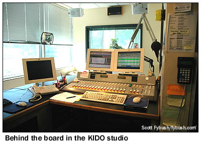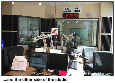 In any event, both stations' heritage is still celebrated in the building; the vintage KFXD sign that once illuminated the transmitter site now glows from a prominent spot on a second-floor wall, just across from the stairway that leads down from reception and sales to the studios on the ground floor. And the 80th anniversary of the KIDO call letters is being marked right now by the History of Idaho Broadcasting Foundation, which may end up working with the station on a book about its history. The studios downstairs are all arrayed along a long hallway, with the FMs at one end and the two AMs at the other. The KXLT studio is typical of the cluster, with a Harris console and Prophet voicetracking running the show this midday. KIDO's setup is a bit more complex - there's a control room that looks into a big corner talk studio, and an on-air newsroom that looks into both rooms.