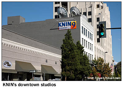 The former KBOI-TV, the second Boise TV station to survive, is now CBS affiliate KBCI (Channel 2), and its studios at 140 N. 16th Street are just a couple of blocks from Citadel, in a building shared with an auto-parts store. (Back in the days when KBOI radio and TV were together, they shared a much grander studio at 1007 W. Jefferson, a few blocks southeast of here; that building has been razed and is now a parking lot, sadly.) The newest VHF station in town is CW affiliate KNIN (Channel 9), licensed to Caldwell but operating from an office building at 816 W. Bannock, just a few blocks from the state capitol building, which was undergoing massive renovations when we visited. Since our visit, Banks Broadcasting signed a deal to sell the station to Journal Broadcast Group, which will make it part of a duopoly with KIVI-TV, about which more in a moment.