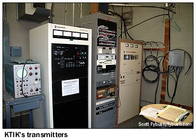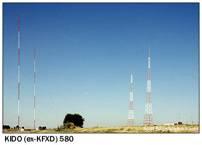 KTIK's site sits within view of another four-tower array, the oldest site in this tower farm. KFXD was running just 250 watts day, 100 watts at night on 1200 when it built a self-supporting tower on Amity Road in 1935. That's the tower seen second from right in the photo below. In 1946, KFXD (by then on 1230, thanks to the NARBA frequency shifts of 1941) built a second self-supporter to hold the antenna of the short-lived KFXD-FM, and in 1947 KFXD moved to 580, running 1000 watts from both towers. In 1952, the final two towers were added, and 580 settled down with the facilities it still uses today - 5000 watts, directional at night. Most of the Boise radio folks we met still call this the "KFXD site," even though in 2002, Clear Channel swapped calls and formats between KFXD and KIDO (630 Boise), moving KIDO's higher-rated news-talk programming to the better 580 signal.