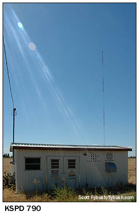 There's but one other site down here in the tower farm: returning to civilization on Cloverdale, we head north past KIDO - er, KFXD - and spot little KSPD (790 Boise) off to the side on Bott Road. "K-Spud" (we are in Idaho, after all) runs 1000 watts by day, 63 watts at night, and we thought those rays of sun shining into the picture were sort of appropriate, since it's a religious station. We'll finish off with some sites at the western edge of the Treasure Valley, some of them as much as 50 miles west of Boise. Payette sits on the Oregon border, and until just last year, it had its own AM station, KIOV (1450). KIOV's old tower still stands on a hill overlooking Payette, a few miles north on US 95 from the last Idaho exit on I-84; thw tower was also once used by Payette's FM station, KQXR (100.3), which moved a few years back to Freezout Hill near Emmett, Idaho, north of Nampa, giving it a booming signal into Boise. (It's part of Journal's cluster, doing modern rock as "the X.") Later, the tower was used by KSRV-FM (96.1), licensed to Ontario, Oregon, as the first step in its move-in to the Boise market. KSRV put those bays on the Payette tower, then left them behind when it moved to Deer Point a few years ago - and we'll see that site, too, next week. A few months before our visit, KIOV changed city of license to Notus, Idaho, and its new tower sits right off I-84, 15 miles east of the state line and about 36 miles west of Boise. Thanks to decent ground conductivity, its 1 kW is quite listenable in most of the market by day. (It programs mostly Sporting News Radio.)