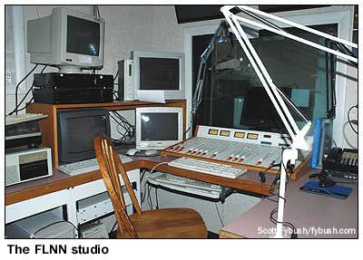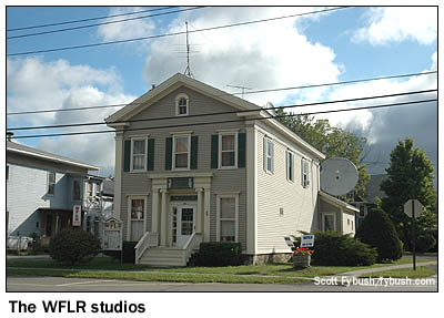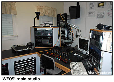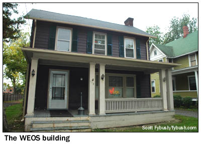 A short walk from Winn-Seeley brings us to the WEOS studios, which moved to this house on the edge of campus (facing Routes 5 & 20) in 1998. The main WEOS studio, Logitek console and all, is at the back of the building, facing another room that's used for talk programming and the occasional live performance. The WHWS-LP studio is in the front, behind that neon sign in the window, and there are offices upstairs. As WEOS continues to grow - it has a CP for another signal down in Ithaca, WITH (90.1), and a pending application for a new signal on 90.3 in Auburn - it may eventually move to larger quarters; for now, though, this little house does a fine job of providing public radio and community programming to the Finger Lakes.
