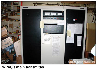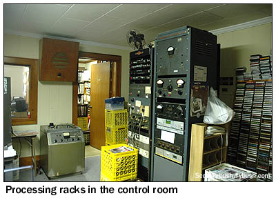 WPAQ's technical facilities are relatively simple: the station is non-directional from the tower right out back, running 10,000 watts during daylight hours, 1,000 watts during critical hours, using a relatively recent Harris DX10 in one of the small rooms right behind the main control room, to the right of the racks that sit right behind the DJ position. Those racks are remarkable in their own right: those old General Radio modulation and frequency monitors in the right-hand rack are still working, complete with Ralph Epperson's handwritten notes attached. There's a whole history of audio processing in the left-hand rack - CRL gear near the top, the mighty Audimax/Volumax combo near the bottom, flanking a Symmetra-peak, not to mention some vintage Collins and RCA boxes that I think are out of the airchain now. Two small rooms off to the left of the rack (and to the DJ's right) serve as a newsroom/production studio and a record library; tucked back behind the record library is a storage room/engineering shop that also houses an old CCA transmitter that preceded the Harris. The Eppersons maintain an "open-door" policy at WPAQ, so if you find yourself in the region, make that drive to Mount Airy and do what we failed to do back in 2003: knock and say hello! And if you can't make it to the Blue Ridge region any time soon, there's excellent news: WPAQ now streams (and sells cool T-shirts and fridge magnets) from its website at wpaq740.com, so wherever you are in the world, you can tune in - and now you know what it all looks like behind the scenes. (One more note - in lieu of a Big Trip this year, we're coordinating this series of Tower Site of the Week presentations with weekly audio updates over at our sister site, Tophour.com, so be sure to head over there each Wednesday to hear the IDs we gathered as we made this trip last year.)