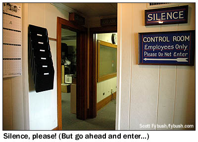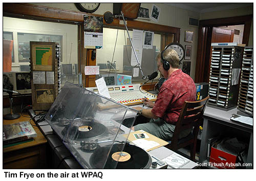Heading back out into the hallway, we find a smaller studio off to the side, presently vacant but soon to be rebuilt as the new home of sister station WSYD, moving from its present facility across town - and the door to the control room, graced by the vintage "Employees Only - Please Do Not Enter" sign that we cheerfully ignore as Jennifer Epperson leads us into the heart of WPAQ. Midday guy Tim Frye is on the air as we walk in, and yes, those are actual LPs and carts he's playing. WPAQ has accumulated a tremendous collection of regional music over its six decades on the air, going back to the days of transcription discs and wire recorders; thankfully, the oldest and most valuable material has been transferred to the University of North Carolina for preservation. But there are still thousands of LPs, CDs and cassettes here, and they all get played. (It's not uncommon for a band to come in to drop off a new album and end up playing live on the air, as we saw back in 2003.)