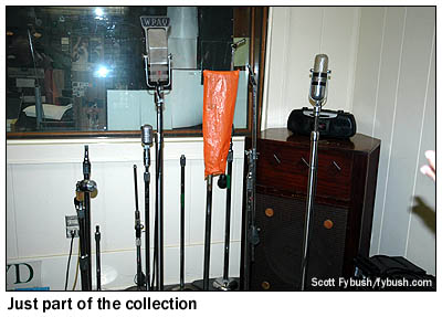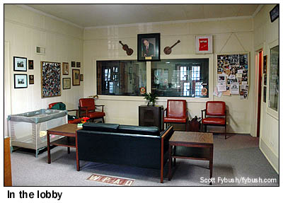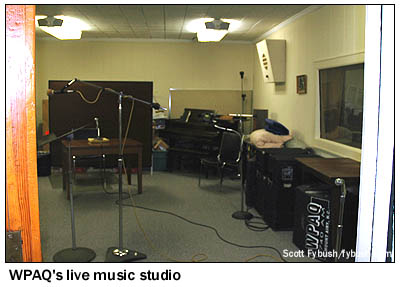 WPAQ's business offices flank the main lobby - and off to the right, another door leads down the hallway to the studios and transmitter room. The typical station layout of the forties included not only a control room but a true studio, where bands could perform, radio dramas could play out and preachers could come in and preach on Sunday morning. In most surviving examples of radio architecture of the era, those big studios have been broken up into offices, converted into newsrooms, or repurposed as studio/control rooms for sister FM stations. Not so at WPAQ: here the studio is still a studio, complete with windows looking out to the front lobby and in to the control room, plus a table for an announcer, a piano in the corner, a huge monitor speaker on the wall, and a collection of vintage microphones that would make any serious mike collector either break down in the corner weeping - or perhaps grab a few gems and try to bolt for the door. (Not so fast - for this is a real studio door, many inches thick and made of heavy pine wood.) At WPAQ, though, those old RCA 44s and 77s are still very much in use, not only here in the studio but out in the field, where WPAQ puts on a live music show, the "Merry-go-Round," from the Cinema Theater in downtown Mount Airy every Saturday. And we can't walk out the door of Studio A without a tip of the hat to the amazing array of talent that's played within these walls: Ralph Stanley, Flatt and Scruggs, Charlie Monroe, Grandpa Jones, and the list goes on and on.