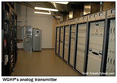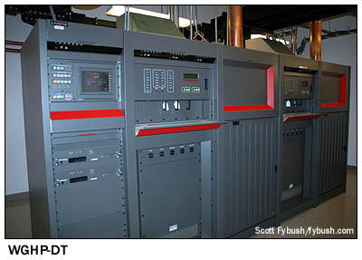 By the time this site went into operation, WGHP had come a long way from its old days as an ABC affiliate. After passing through a series of owners, including Taft and its successors Great American and Citicasters, the station ended up in the hands of New World Communications in 1994. New World, of course, quickly became involved in one of the biggest deals in the history of TV affiliation swaps, moving its dozen stations, most in medium and large markets, over to Fox - and in the process helping to turn the "Big 3" network system that had held for decades into the "Big 4." (Someday, if I ever have the free weekend I dream of, I'll finally put together a little website chronicling all those affiliation changes...) WGHP flipped from ABC to Fox on September 9, 1995, sending ABC over to the former Fox affiliate, WNRW (now WXLV) on channel 45. A few months later, Fox bought the station outright from New World, giving the Triad its first - and so far, only - network O&O. When we visited, WGHP was in the process of being sold again, as Fox spun off most of its smaller-market properties to Randy Michaels' Local TV group. The station was also making preparations for the big analog shutdown in early 2009, which will see WGHP give up its temporary channel 35 digital allotment, moving its digital signal back to channel 8. The Larcan TTP44MH analog transmitter that went into service in 2006 will be easily adapted to digital: since it's essentially a big array of individual solid-state amplifier modules, it will be split in half, with one side continuing in analog at half power while the other side is converted to channel 8 digital use. After transition day, the analog half will be moved over to the 1963 building and converted to digital to serve as a full-power aux. Meanwhile, the channel 35 transmitter, one of the few Larcan UHF DTV transmitters we've seen in use, will be moved southwest to sister station WBRC in Birmingham, which will stay on UHF after the transition. It's quite a long way from those early days in the mezzanine of the Sheraton Hotel - and well worth a stop on our way down to Charlotte, don't you think? (One more note - in lieu of a Big Trip this year, we're coordinating this series of Tower Site of the Week presentations with weekly audio updates over at our sister site, Tophour.com, so be sure to head over there each Wednesday to hear the IDs we gathered as we made this trip last year, including a nearly-complete run of Triad radio.)
