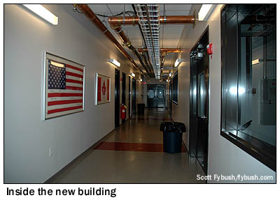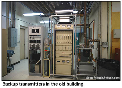 A two-minute drive back out to US 311 and over to Old Courthouse Road, the next side road to the east, brought us four decades into the future: the 2005-06 construction of WGHP's new site provided much more space for the station to move into the DTV era. The new building contains more of everything: better power supplies, room for emergency switching so that the station could handle some rudimentary program origination if the studio were to become unusable, a spacious engineering office, and separate rooms for full-power analog and digital transmission. (Those flags in the hallway? They honor the tower crew, some of them Canadian, who erected the new 1248' tower that went into service in March of 2006.)