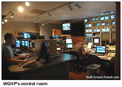 By the time we pulled in at the WGHP studios on Francis Street, a small frontage road on the south side of Business I-85, the 5 PM news was already on the air, so we got to see the station in full swing as Layno showed us around the building. A bit of history here (with much more over at Layno's own Triad TV History website, for those who are interested): WGHP came to the market's airwaves a bit later than the other Triad VHF stations. In Greensboro, WFMY (Channel 2) had pioneered the medium, signing on in 1949 and becoming the CBS affiliate for a huge swatch of central North Carolina and southside Virginia. WSJS-TV (Channel 12) came on in 1953 from Winston-Salem, carrying NBC and some ABC programs. Many viewers in the Piedmont could also see ABC from Raleigh's WRAL-TV (Channel 5) to the east; indeed, the cities of the Carolinas are all so closely spaced that even now, many viewers with rooftop antennas can easily watch the neighboring Raleigh-Durham and Charlotte signals from the Triad. Channel 8 was opened for applications in the early sixties, and amidst a number of competing applications for the channel in Greensboro and Winston-Salem, Southern Broadcasting's application to put a first TV service in High Point stood out. Southern was granted the construction permit, and in August 1963 it began erecting a 1255' tower in Randleman. Rayno reports that a crack in a support leg of the tower forced the tower to be dismantled when it hit the 900' mark, then rebuilt after the bottom section was replaced, delaying channel 8's debut by two months. On October 15, 1963, the new station - christened WGHP for Winston-Salem, Greensboro and High Point and serving as the region's primary ABC affiliate - made its debut from "temporary" studios at the Sheraton Hotel in downtown High Point, a location it would call home for more than two decades. In 1984, WGHP moved to its present home, a modern two-story brick building. All of the broadcast operations are on the first floor - the news studio just beyond the front door, a spacious newsroom off to the right, and a control room/engineering hub that was in the process of being upgraded when we visited, as the 1980s-era wiring and automation gave way to 21st-century digital technology.