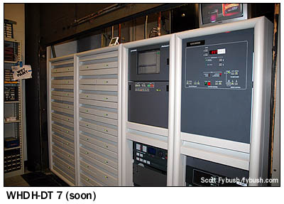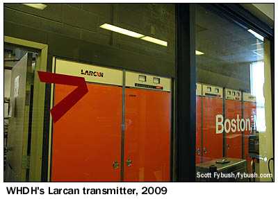 Today, the site is a little more crowded. The FM is gone, having left this site in the early eighties when RKO was forced out of broadcast ownership and its radio and TV holdings went to separate owners. The FM became WROR, and later WBMX, and now uses the "FM-128" tower, the former WHDH-TV 5, a mile or so away. Channel 7 went to supermarket entrepreneur David Mugar, becoming WNEV in 1982, then - ironically - WHDH-TV a decade later. Not long after the call change, Mugar sold Channel 7 to Miami's Ed Ansin, who still owns it today. Relics of the WNEV era, and even its distinctive "SE7EN" logo, still abound at the site. Downstairs, there are several utilitarian rooms handling the site's incoming AC power and housing big generators. The transmitters are all upstairs, where a stairwell opens up into several small rooms - one an office, with files dating back to this site's early years, another (which I think once held WNAC-FM) housing the temporary WHDH-DT (Channel 42) setup. Those rooms look out into the big room seen in that 1964 photo, though the spot where the engineer sat at his console was eventually replaced by a glass wall separating the engineers from newer transmitters. That distinctively orange Larcan was the first VHF transmitter the Canadian company sold in the US, back in 1984, and it was still going strong when we visited a quarter-century later, occupying barely half the space that old RCA TT-50DH took up.