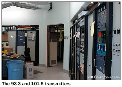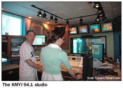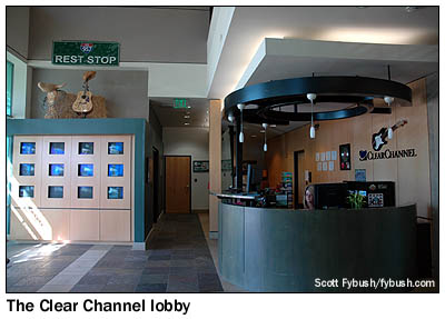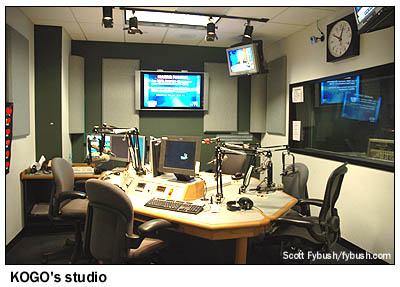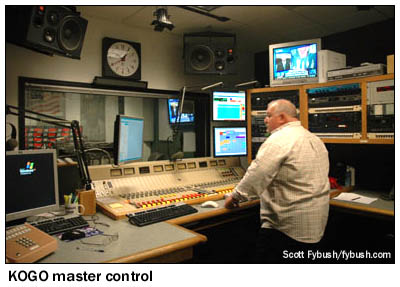 We met up with Scott at Clear Channel's studios at 9660 Granite Ridge Drive, amidst the office-park sprawl just north of Qualcomm Stadium. Clear Channel moved all of its stations under a single roof here in 2001, and for a time there were more stations at this address than at any other in America, thanks to a clever end-run around multiple ownership laws that found Clear Channel at least briefly owning seven stations with US licenses, operating an eighth US-licensed station (KSDO 1130), and operating five more with Mexican licenses. A change in the interpretation of ownership rules forced Clear Channel to divest its Mexican interests not long after the move here, and there's now a wall running through part of this facility that separates those studios - now operated by competitor Finest City Broadcasting, which took control of XHITZ (90.3), XETRA-FM (91.1) and XHRM (92.5) - from Clear Channel's remaining stations. (There's now a separate door in the back of the building to enter the Finest City part of the building, which we didn't get to see this trip.) When we visited, those included two AMs - news-talk KOGO (600) and sports KLSD (1360) - and five FMs, top 40 KHTS (93.3 El Cajon), hot AC "Star" KMYI (94.1), country KUSS (95.7 Oceanside), classic rock KGB (101.5) and active rocker KIOZ (105.3), all strung out along two hallways in the middle and back of the building in a fairly typical modern cluster layout.
