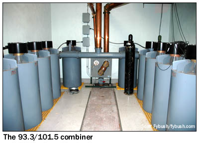 For AM 1360, the upper half of the tower is detuned, leaving a half-wave radiator below, fed by a Gates Five inside, backed up by an older Collins Power Rock. At one time, this building must have presented an impressive appearance to visitors, with its old RCA transmitters on either side of a door leading to the back rooms. Now those walls are filled by the Continental FM transmitters, with the AM boxes, the FM HD, the combiner, and an old RCA FM backup transmitter filling the spaces behind. And we can't leave the corner of 52nd and Kalmia without noting an interesting irony: after KGB's old rival, KCBQ, lost its Santee transmitter site to development (a Lowe's hardware store) a few years ago, KCBQ - now a religious station owned by Salem - ended up finding a temporary home right here at the KGB site, operating into a drop-wire antenna hung from insulators on one of the tower's guy wires. It has since moved again, and now diplexes with KECR (910 El Cajon) on a site far to the east of San Diego. (I should note, too, that 1360 itself had an application a few years back to increase power to 50 kW, diplexing on the KSDO 1130 site in Santee; that application was recently dismissed at Clear Channel's request.)
