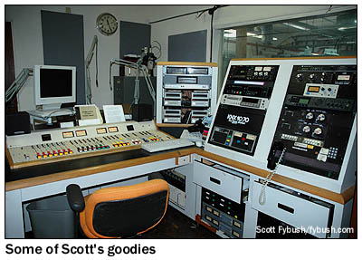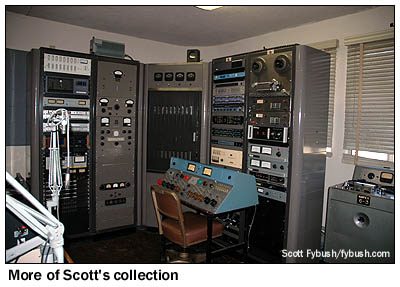 Scott's love of classic gear is obvious here, in a room that's been built out into a fully-functional studio, complete with a vintage RCA M-series transmitter, lots of processing, cart machines, even consoles and furniture. There are multitrack tape machines that came out of Hollywood recording studios - and yes, Scott can tell you which classic albums were recorded on each ones - and if that beautiful RCA console above looks familiar, it should: it was Rick Dees' board at one point!