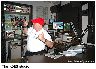So why travel all that way just to hear an oldies station? We didn't. (Though with guys like KRLA veteran Russ O'Hara, above, on the air, KDES is a great-sounding station.) You see, once the 104.7 move is complete, the plan is to keep the KDES oldies format alive - but down the dial on the big 98.5 FM signal licensed to nearby Cathedral City. It's that station we really wanted to hear, and to visit, because in its current incarnation, it's one of the last survivors of an era of radio that's all but gone. And fortunately for us, it's also one of Glen's engineering clients; indeed, he's been associated with the station, KWXY, since the sixties.