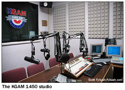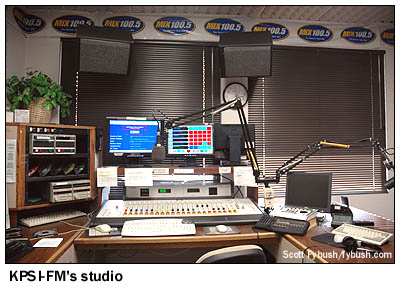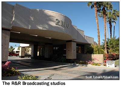 When we visited, the R&R building at 2100 E. Tahquitz Canyon Way was home to three AMs - talker KPSI (920 Palm Springs), progressive talker KPTR (1340 Cathedral City) and sports KGAM (1450 Palm Springs) - and two FMs, AC KPSI-FM (100.5 Palm Springs) and oldies KDES (104.7 Palm Springs), all clustered neatly together in a pod of studios at one end of the building.