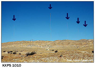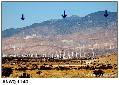 The Morris AMs are all located on the relatively undeveloped north side of I-10, and their skinny towers are not easy to see in the bright sunlight, especially against the desert hills that rise behind them in the background. That might explain why our pictures of the KNWQ (1140) site, the westernmost of the Palm Springs AMs, ended up featuring just three of the five towers that make up that array, which runs 10 kW days, 2500 watts nights, DA-N. (And all those wind turbines, just a tiny fraction of the immense wind farm that lines the I-10 corridor west of Palm Springs, didn't help set off the towers, either.) We did get all five towers of KXPS (1010), the next site to the east, in the frame - but it took some sharpening and contrast manipulation to bring them out even enough to label them for the photo below. This is one of the market's newer stations, dating only to the late eighties, with 3600 watts by day, 400 watts at night. About a mile to the northeast sits the two-tower array of KFUT (1270), which runs 5 kW days/750 watts nights.