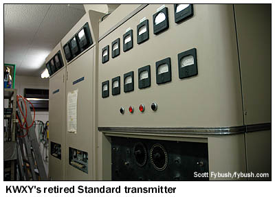 98.5 is, at least for the moment, an honest-to-Mantovani beautiful music station, complete with songs being played off open-reel tape and a lineup of live, local jocks that includes none other than Dave "The Hullaballooer" Hull, the Los Angeles top-40 veteran who retired to Palm Springs but never stopped doing radio. Dave is just starting his evening airshift when we get out to the KWXY studio on Dinah Shore Boulevard in Cathedral City, in a lovely little building that's a time capsule from an earlier era of radio - a big office area in front, a production studio and air studio off to the left of the entrance, with the old KWXY(AM) Raytheon transmitter (in use on the station's first day, October 4, 1964) visible through the glass beyond, right next to the 3 kW Standard FM transmitter that's still capable of being used as a backup for KWXY-FM. There's an addition in back for more sales offices. (KWXY's former AM is now KPTR on 1340; it and KGAM 1450 are diplexed into the tower out back, which is festooned with dozens of cell-phone antennas as well.)