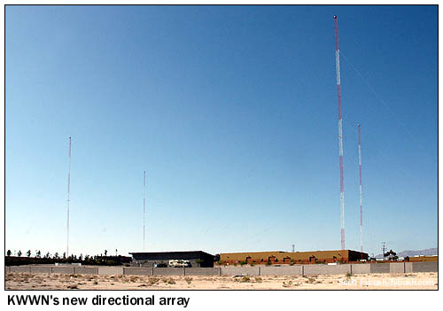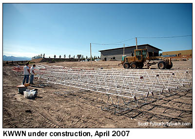 This is "ESPN 1100," KWWN Las Vegas, first applied for in 2003 and granted in April 2005. It's part of the ever-growing Lotus Broadcasting family in Las Vegas, co-owned with two of the city's oldest stations, KENO (1460) and KBAD (920), as well as three FMs. Our 2007 visit to the site, on Martin Luther King Boulevard in an industrial section of North Las Vegas, found chief engineer Bill Croghan right in the midst of construction. The site had been cleared and graded, the concrete-block transmitter building had just gotten a roof (but was still lacking doors), the tower bases had been poured, the trenches had been dug for transmission lines, and the used tower segments had just been delivered and were in the process of being painted. By the time we returned a year later, what greeted us was a fully-functional transmitter site (though not quite a licensed one; the license to cover wouldn't be granted for another month, coming through at last on May 8, 2008.) KWWN uses four 211' guyed towers, cranking out 20 kW by day from two of them and 2 kW at night from all four. By day, the signal fills a big void on 1100 surrounded by co-channel stations in Bakersfield, Grand Junction and Phoenix; at night, the signal is a north-south figure 8 with a deep notch protecting co-channel WTAM in Cleveland.