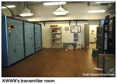 Building a new site in an urban area presented some interesting challenges for Bill. The city mandated a gated concrete-block wall around the entire property, not to mention a wide paved roadway into the facility and a sizable parking lot for the building. The building itself is of some interest: it was built much larger than you'd expect for a new AM, in part to provide Lotus with some much-needed storage. A third of the building is used by the promotions and business departments for off-site storage, another third is a big garage for storing promo vehicles and the snowcat that's used in the winter to get up to Bill's FMs atop Mount Potosi, and even the middle third, where the Nautel XR25 transmitter, J1000 backup transmitter and Kintronics phasor are located, has plenty of expansion space (as well as nice-looking woodgrain linoleum flooring.) Why the extra room? At one point, Lotus contemplated moving its other AMs, now diplexed at a separate three-tower site a couple of miles away, to this location. As it turned out, the only thing that moved was the ESPN format: while 1100 signed on in late 2007 with ESPN Deportes Spanish-language sports, Lotus did a three-way shuffle in early 2008 that moved ESPN from KBAD 920 to KWWN 1100, Fox Sports from KENO 1460 to KBAD, and ESPN Deportes from KWWN to KENO. One more note before we move on: if you're reading this during NAB, and you decide to make the drive up MLK Boulevard to take a peek at this new site, you might think you're approaching a five-tower site, not four. What looks from a distance like the fifth KWWN tower is actually a slightly older site right next door, bordering the KWWN site on the south. That single 253' tower went up in 2003 for KSHP (1400 North Las Vegas), which moved from another tower that still stands east of MLK, and later became the diplexed home of KDOX (1280 Henderson), which had been operating from a site down in Henderson. Yes, there's plenty of detuning going on at both sites!