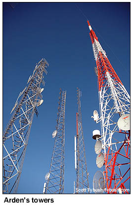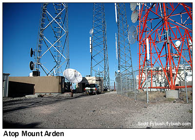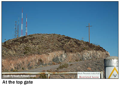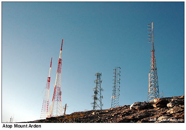 ![]() April 24, 2009 Mount Arden, Las Vegas, NV - and more Back in the spring of 2006, our annual April visit to Las Vegas for the NAB Show found us fulfilling two of our longtime tower-hunting goals: we went up the hill to the Black Mountain Henderson site that's home to most of Sin City's FM stations and a few of its TVs - and then the next day, we took the even longer, bumpier ride up Mount Potosi, one of the nation's legendarily remote big-city FM sites. But those trips still left us with some holes in our Vegas FM/TV coverage, which is why we were delighted, a year later, to get an invitation to go up the third major mountaintop site in the market, the small cluster of sticks about four miles south of Black Mountain Henderson known variously as "Black Mountain Arden" or simply as "Mount Arden." ![]() At 4330 feet or so above sea level, the top of Arden provided a big increase in height when the first TV stations started moving up here from their original towers on the valley floor in the late sixties and early seventies. As best I can reconstruct the history, the first station up here was ABC affiliate KSHO (Channel 13, now KTNV), which moved up here in 1969 from a tower that still stands behind its Valley View Drive studios (which had in turn replaced the original site at the El Rancho casino.) The KTNV tower is the second from left in the photo above - and judging by the phone number on the "Restricted Access" placard at the gate, KTNV continues to control access to the mountaintop 40 years later. Howard Hughes' CBS affiliate, KLAS-TV (Channel 8), was the next to go for Arden's height, around 1971, trading its old tower behind the Desert Inn casino for the tower seen at left in our view of Mount Arden above. (KLAS had held at least an application to develop remote Mount Potosi for TV use, but never built that out, which is understandable given the challenges of getting even a simpler FM site there built two decades later.)