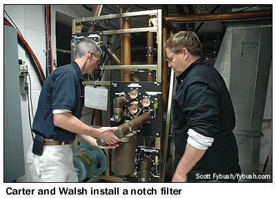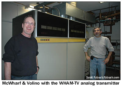 The rest of WHAM-TV's transition went quickly: engineer Lou Volino and his retired colleague Ted McWharf moved the necessary patches, WHAM-DT channel 13 took to the airwaves, and the temporary WHAM-DT 59 quietly disappeared, leaving a building filled with silent transmitters - the RCA G-line transmitter that had kept 13 humming for a quarter-century, the vintage RCA TT-11 that preceded it, and the channel 59 transmitter downstairs. Next door, though, things were a little more complex: because WHEC's channel 10 shares an antenna with WROC-TV on channel 8, and because channel 8's analog remained on the air through the end of the day on Friday, some quick work was needed to install a notch filter to prevent WROC's analog signal from feeding back into the WHEC-DT transmitter. All told, it took about 17 minutes before Walsh and his colleague Greg Carter were able to turn on WHEC-DT on channel 10, using one set of cabinets from the old Harris Platinum analog transmitter and a new control cabinet. (That's the WHEC-DT 58 transmitter, now silent, just over Greg's left shoulder in the photo below.)