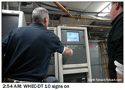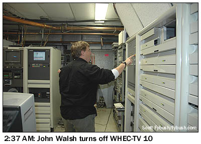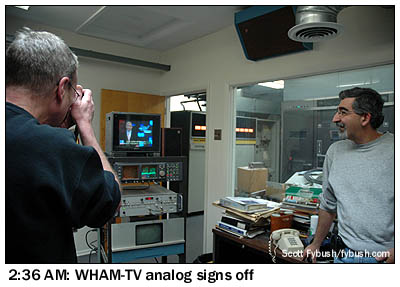 Both stations' plans to coordinate a shutdown of analog around 1:30 AM were thrown for a loop by a late-running basketball game on ABC that pushed back WHAM-TV's late-night schedule, so there was an extra hour or so of waiting before things started rolling. On WHAM-TV, the end of "Jimmy Kimmel" led into a taped message from general manager Chuck Samuels reminding viewers to rescan their DTV boxes to pick up WHAM's relocated digital signal - and with the push of a button from master control, analog channel 13 was gone from the Rochester airwaves after almost 47 years. Just over a minute later in the next building over, there was somewhat less ceremony as chief engineer John Walsh took WHEC-TV's channel 10 analog signal off the air after more than 55 years.