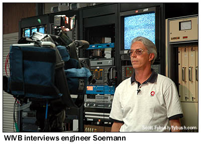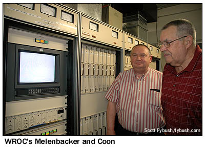 And that left just one: the station that brought TV to Rochester 60 years and one day ago was the last signal on the air with analog programming in the market. What's now WROC-TV (Channel 8) was WHAM-TV on channel 6 when it lit up its first transmitter in the building on Pinnacle Hill on June 11, 1949, and retired chief engineer John Coon says he remembers watching that first broadcast as a child. He ended up spending many years at the station, retiring not long after installing the Larcan solid-state transmitter WROC now uses, and the station was thoughtful enough to invite him up to the hill to do the honors at the end of News 8's 11 PM broadcast. It was a crowded room by the time Coon got to press the button, what with WROC reporter Evan Axelbank (at left in the photo above) and his photographer, GM Louis Gattozzi (looking on at right as the button is pushed), current chief engineer Eric Melenbacker and his assistant, plus the usual contingent of engineers from the neighboring stations on Pinnacle Hill, all here to mark the end of an era as Rochester's first analog signal became its last. (Well, almost...there's still that nightlight operation on WXXI-TV's analog channel 21, and we'll most certainly be back up on Pinnacle Hill on July 10 to see that go dark, too.) Got photos of your local stations pushing the button? Send them along, and we'll run them in next week's Tower Site of the Week...