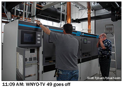 Just two Buffalo-market signals remained as we pulled out of the WIVB driveway: WNYO-TV (Channel 49) and WGRZ-TV (Channel 2). With the latter station making a last-minute decision to go nightlight as of 1 PM, that left just WNYO - and just enough time to head over to its transmitter location on a golf course in western Wyoming County to watch chief engineer Bruce Wilde and director of engineering Don Stewart pull off an interesting transition. WNYO-DT had been operating an interim digital facility on channel 34 from the Grand Island transmitter site of sister station WUTV (Channel 29), but issues with Canadian allocations made that a poor choice for a permanent facility - so with just days to go before the transition, WNYO applied for, and was granted, a move back to channel 49 from the Cowlesville analog site. It took some quick work to install a new digital exciter and convert one of the cabinets of the Acrodyne analog transmitter, but a few minutes after 11:00 it was all ready to go, as Wilde (left) turned off the analog cabinet and Stewart (right) put WNYO-DT 49 on the air. From its site east of Buffalo, WNYO-DT delivers a substantial signal to Rochester as well.