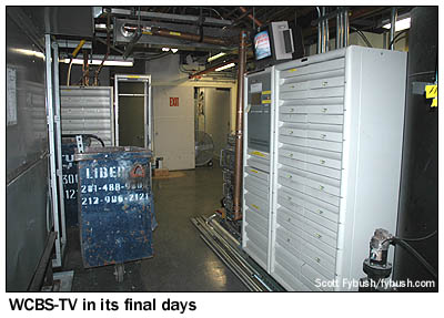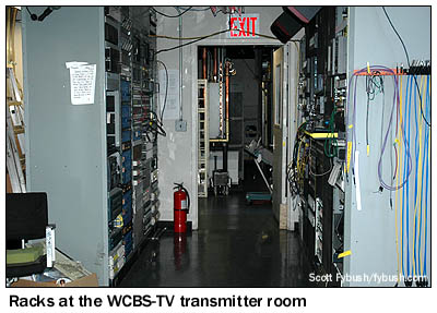 But July 10 wasn't quite the end of the nightlight line - the final drop-dead date for analog full-power TV was actually two days later, on July 12, and one of the last stations standing was also one of the first stations in the country. WCBS-TV (Channel 2) in New York may even have been the very, very last analog station on the air, since there were unconfirmed reports from viewers in the region of continued nightlight operation into the morning of July 13. In any event, we made it up to the 83rd floor of the Empire State Building a few days earlier, on July 7, for a tour of the warren of rooms that make up the WCBS transmitter facility. We'll explore it in more detail in a future Site of the Week, but for now we look at the analog facilities that were silenced a few weeks back: the Harris transmitter that went into service shortly after 9/11 (when WCBS was the only New York VHF station to stay on the air, thanks to its aged GE backup transmitter up in this space, now long gone) and the racks of equipment that are now dark and silent.