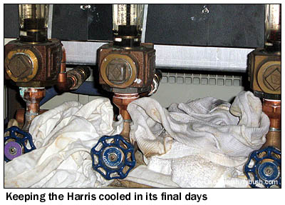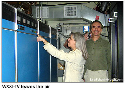 What you see above is the end of the line for analog TV in Rochester, a few minutes after 10 AM on July 10, as WXXI-TV executive VP/GM Susan Rogers took analog channel 21 off the air after nearly 44 years of service. VP of technology and operations Kent Hatfield is hidden behind her, and that's engineer Jan Pazral standing next to her. On the right, you can see the innards of the old Harris that barely limped to the finish line - Jan and his colleagues Nolan Stephany and Russell Roby had to fight several nasty coolant leaks to keep the beast running in its last months, and it's impressive that it made it all the way to the end. (I think this was only the second main transmitter WXXI had in all that time with analog TV.)