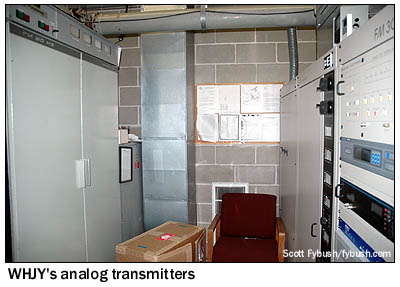 WHJJ is Clear Channel's only AM signal in Providence, but the cluster also includes three FMs, and those are next on our agenda this snowy morning. First up is the site at 115 Eastern Avenue in East Providence, just a mile or so northwest of the WHJJ transmitter. The studio buildings here used to be home to WHJJ and its sister station WHJY (94.1), which started here as WHIM-FM, sister to the AM 1110 station (now WPMZ) that still transmits from the two towers on site. The taller of those two towers (seen in an earlier Site of the Week) is also home to two FMs - WHJY itself and Brown Broadcasting's WBRU (95.5 Providence) - which share a concrete-block transmitter building near the base of that tower. WHJY's room is home to three transmitters, an old Gates FM20H3, a newer BE FM30 and a BE FMi703 for HD Radio, with a combiner tucked into the back corner to combine the 94.1 signal with 95.5, which comes from another BE in the next room. (Sadly, WBRU's old home-built transmitter, crafted and maintained by engineer Craig Healy, was disposed of a few years back.)