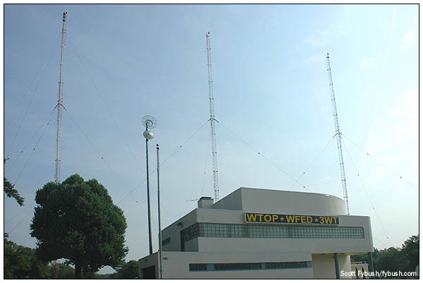 A bit of explanation is in order here: the original WTOP-FM was on 96.3, but unconvinced of FM's future, the Post donated that facility to Howard University in 1971, creating what's now WHUR. In the nineties, as the Washington metro area sprawled far beyond the area that could receive a clear nighttime signal from WTOP on 1500, the station began simulcasting its all-news format on several suburban FM signals. In 2006, WTOP owner Bonneville International moved the calls and the all-news format off 1500 entirely. AM 1500 became WTWP, "Washington Post Radio," in a partnership with the station's former owner, while the former classical WGMS (103.5) became WTOP-FM. By the time of our 2008 visit, "Washington Post Radio" was history, and the AM 1500 signal had become talker WWWT, "3WT" - and not long after that, 3WT was itself history and 1500 had become the new home of Bonneville's surprisingly successful niche format, Federal News Radio, under the calls WFED. (The WFED calls and format migrated up the dial from another station with Wheaton roots: the AM 1050 licensed to Silver Spring, Maryland went through a series of identities that included WQMR, WGAY, WNTR and WKDL; it subsequently took the WTOP calls itself as a simulcast of 103.5, and today it's leased out as a progressive talker, WZAA. There's a pending construction permit to move 1050 from its longtime home on the nearby Sligo Creek golf course to a diplex on one of the 1500 towers.) At its new 50,000-watt home on 1500 (with a relay on WWFD 820 in Frederick, Maryland), WFED occupies an interesting niche on the DC radio dial, super-serving the large number of area residents who draw an income from the U.S. government. All those complaints about the WJSV signal from the 1930s still hold true today: while the signal booms up and down the East Coast at night, it's non-existent in many parts of Virginia (and Maryland, too) that were rural farmland in the thirties but are now densely-populated DC suburbs. Those co-channel stations (especially KSTP in Minnesota) that wreaked havoc on the Washington signal back then are still factors today, though a 1990s interference deal with KSTP and co-channel WLQV in Detroit allowed all three stations to loosen up their patterns a bit. It's been a long and sometimes bizarre 83 years from the Klan in Brooklyn to Federal News Radio in Wheaton, and this site stands as magnificent testimony to the sweep of that history. While the staton inside no longer answers to "WTOP" (unless the 103.5 auxiliary transmitter is on the air), this is still an important piece of the Washington radio landscape - and truly a treasure of American broadcasting history.