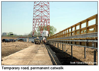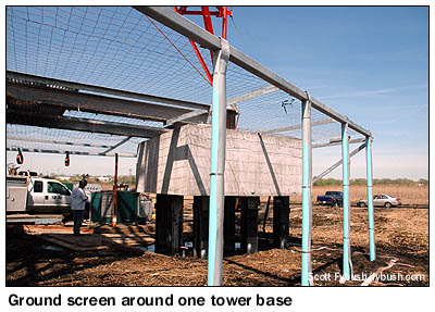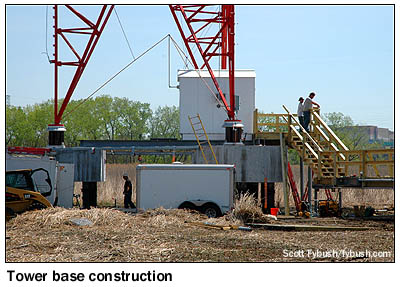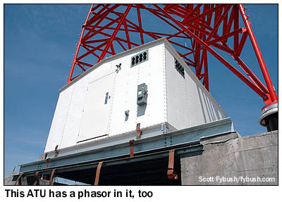 It was May by the time we made it out to see the site for ourselves, and by then the towers were standing proudly against the skyline. It's an interesting site for several reasons: for one, it sits in wetlands so deep that it's over a hundred feet down to bedrock in some areas, requiring deep piles to be driven to support the towers. You don't bury transmission lines in a swamp, of course, so those run between the towers in a raceway attached to a wooden catwalk, which will carry engineers back and forth between the towers once the construction is completed. During the construction project, there was a temporary road that ran from the transmitter building site, behind the Secaucus public works building next to the Turnpike toll booths, out to the towers themselves, nearly half a mile distant. (With that sort of distance, it made sense to run just a single transmission line from the building out to the first tower, where the phasor sits in a prefab structure that also houses that tower's ATU.) All of that temporary roadway was removed once the towers and catwalk were in place, and by now the reeds and rushes should have grown back to their usual height, leaving the area around the towers back in its natural state - which means these are the only photos you'll probably ever see of these towers from "ground level," such as it is in the marshy Meadowlands. (It was rather disconcerting at first to feel the temporary road sway almost like the deck of a boat as trucks drove back and forth!)