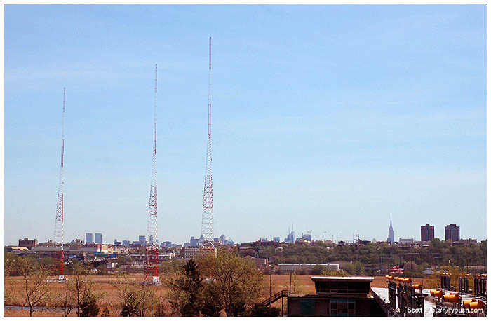 As the nation's largest radio market, New York City has played a part in every Tower Site Calendar so far, and 2010 is no exception. The new calendar features a brand-new site: the new home of ESPN Radio's New York flagship, 50,000-watt WEPN (1050), and there's quite a story to tell about how WEPN got to this site, spanning the border between Secaucus and North Bergen, N.J., from the longtime home of AM 1050 a few miles to the northwest near Giants Stadium. You can see our 2005 visit to the old site here - and if you look behind the old towers in the photo at the top of that page, you'll see the arena (then Continental Airlines Arena, now Izod Arena) that sits north of the old site, and a big, empty piece of land between the arena, the old site and Route 120. But by the time we visited the old WEPN site in 2005, that empty land was already starting to be transformed into a huge retail/entertainment/amusement venue to be called "Xanadu." And as the cranes and the steel for Xanadu started to rise in 2005-2006, just a football's throw away from the WEPN towers, it became clear that a 50,000-watt directional AM facility wasn't going to coexist comfortably with a huge shopping mall and amusement park right next door. As an interim measure, WEPN installed a transmitter at the Lodi, N.J. site of then-sister station WABC (770), and for several years that site saw plenty of use while the cranes were swinging next to WEPN's main site. Meanwhile, ESPN started looking for new sites, and after a few false starts and lots of negotiating with state and federal officials, WEPN settled on a piece of land just east of Exit 16E on the New Jersey Turnpike and just south of the entrance to the Lincoln Tunnel.
