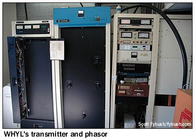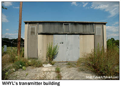 This building used to house WHYL-FM (102.3 Carlisle), too; that facility is now WCAT ("Red 102.3") and is owned by Citadel, programmed from a cluster studio in the Harrisburg suburb of Camp Hill. (Citadel had briefly owned the AM station as well before selling it and several Scranton-area signals to Route 81 back in 2004.) From the WHYL studios on Walnut Bottom Road, it's a quick jaunt east on I-81 (the signs say "north," but the highway really runs east-west past Carlisle) to the two-tower transmitter site that abuts the north side of 81 between the Hanover Street and York Road exits. While the pair of 269-foot towers are easily seen from I-81, they're not easily accessed; the dirt road that leads back to the transmitter site actually starts on the far side of the property, at the back of an unmarked driveway between two houses off Spring Garden Street. Once we find the way back to the big field where the towers sit, a tour of the transmitter shack is a fairly quick affair: there's a Harris SX-series transmitter that's been giving Bruce some overheating troubles (he's since fixed it), a phasor and some STL and processing gear, and that's about all it takes to put out 5000 big watts by day and 22 not-so-big watts after dark.