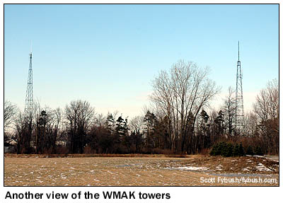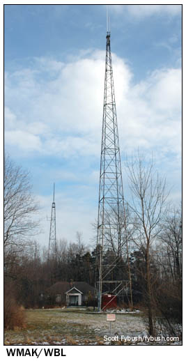 Every once in a while, an interesting piece of broadcast history will be found sitting in plain sight - and every once in a very long while, that interesting piece of broadcast history is just an hour or so away from our home base here in western New York. We credit Jim Travis, chief engineer for the Family Life Network, for unearthing this week's featured site, which hasn't seen broadcast use since at least 1940. Jim drove by this site at 7263 Shawnee Road in North Tonawanda, north of Buffalo (actually, it's just over the line in the town of Wheatfield), a month or so ago and wondered what these two self-supporting towers were doing in an area that's rapidly being developed into residential subdivisions. He asked former upstate engineer (and broadcast engineer) Mark Humphrey, who began to uncover the fascinating history behind these towers and the building that sits between them. What Mark found first was a website describing the history of marine shortwave/VHF station WBL, which operated from out here on Shawnee Road from the early 1940s until sometime in the early eighties, first under RCA ownership and later in private hands. (It turns out that one of the operators at WBL in the seventies was Dan Gurzynski, who'd later go on to be an engineer at the Entercom stations in Buffalo.) But before these towers belonged to WBL, they served as the transmitter site for one of the Buffalo area's first radio stations. WMAK came on the air in Lockport, 10 miles north of this site, in 1922. It soon moved from little Lockport to much bigger Buffalo, where engineer I.R. "Ike" Lounsberry set up studios in the Hotel Lafayette, making WMAK (by then a charter CBS affiliate) the first of several broadcasters who would call that building home. In 1927, Lounsberry moved WMAK's transmitter from the Norton Laboratories on Mill Street in Lockport to this Shawnee Road location, erecting these towers and the building between them. So far, so good - but there's actually much more to be said about what happened next. When we put these pictures up in 2008, I knew part of the story: after just three years on Shawnee Road, WMAK left its 900 kilocycle frequency, this site was sold to the Buffalo Evening News, and the frequency became the home to a new station, WBEN, which would remain here for more than a decade before moving to its current transmitter site on Grand Island in 1941. What I didn't know was exactly why WBEN never chose to acknowledge its early roots as WMAK, but with the help of some further research, aided immensely by David Gleason's scans of 1920s-era RADEX directories at americanradiohistory.com and by the FCC's scans of early Radio Service Bulletins, the rest of the story now comes into focus: