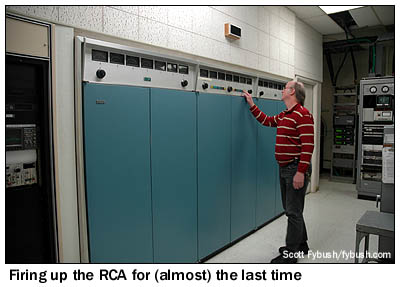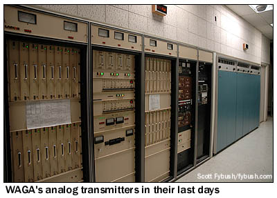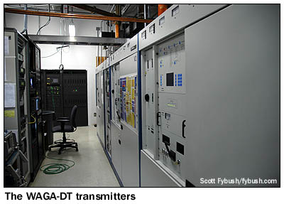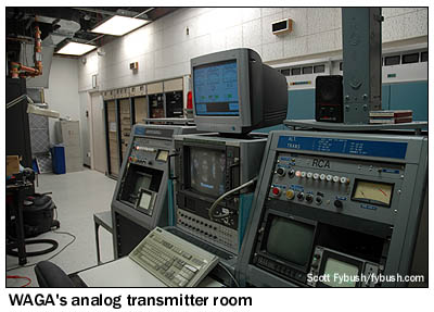WAGA-TV has been through plenty of changes since this building was dedicated in January 1966. A series of sales following Storer's exit from broadcasting in the mid-80s eventually landed channel 5 in the hands of New World Communications, which in turn led to an affiliation change in 1994 that flipped WAGA to Fox. (CBS moved to what was then WGNX-TV, channel 46, while former Fox outlet WATL-TV 36 went independent.) In 1997, Fox swallowed New World, making WAGA an owned-and-operated station - and one of the most successful Fox outlets in the country, routinely leading every station in the market except the massively dominant WSB-TV in the ratings. And it's with that background that we walk up to the front porch and into the wood-paneled lobby, where it's still Storer-ville, circa 1966, complete with fancy furniture and, yes, a player piano in the corner. The layout of the building is interesting indeed: the "mansion" that faces Briarcliff Road is only a small part of what's actually a very big building that sprawls out to the rear. The front portion houses the administrative and programming offices, which have retained much of their Storer-era character. The rear portion, offset by half a floor from the front, is where the guts of the station sit - and where most of the change since 1966 has taken place. Our tour starts on the north side of the building, where the original 1955 transmitter building was incorporated into the big 1966 expansion. Our visit in February 2009 came at the very end of analog channel 5, which was then being broadcast from a relatively recent Larcan solid-state transmitter occupying one side of the old transmitter room, next to the much older RCA that was still capable of being fired up as a backup. (The Larcan would get a starring role a few months later on the last night of WAGA's analog transmission, when 99-year-old former chief engineer Paul Cram, who'd turned WAGA-TV on in 1949, returned to the station to turn off the channel 5 signal for good; as with everything else in the world, the clip is of course available for your enjoyment on YouTube...)