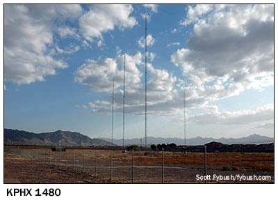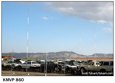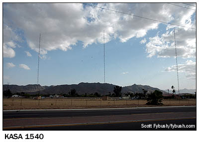 Heading west on Baseline, we find the studios and transmitter of another Spanish station, KASA (1540), at 1445 W.Baseline, less than a mile north of still another Spanish outlet, KIDR (740), on Dobbins Road. (Somehow, we missed the chance to go around the corner to see KIDR on this trip!) KPHX (1480), with a pretty four-tower array just south of Broadway at 23rd Ave. (in Phoenix, numbered streets run north-south to the east of Central, while numbered avenues run north-south to the west of Central) has been through plenty of formats over the years; it was doing standards during this visit, with LA jock Brad Chambers running his "Martini in the Morning" show. And the last of this cluster of towers, KMVP (860), can be found behind a junkyard at Broadway and 31st Ave. Part of the Bonneville cluster, KMVP had been running the sports format that moved to KTAR (620) when KTAR's news-talk moved to FM; it ended up being leased out to a religious broadcaster in addition to being used for some overflow sports programming from 620.