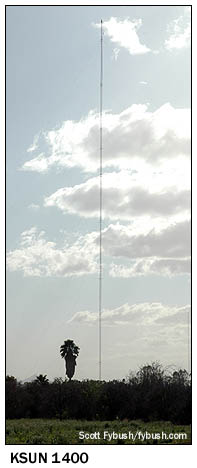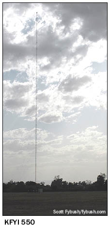 By far the largest cluster of Phoenix AM sites can be found along a swath of dusty desert landscape that stretches south of downtown Phoenix along Baseline Road and Broadway. This is not tourist Phoenix - it's a poor part of town that's a mix of industry, agriculture and mostly Hispanic neighborhoods. At the eastern end of the tower cluster is another tall tower for a graveyard station: KSUN (1400) at 40th Street and Southern Ave. is Spanish now, but was once full-service KXIV. It sits just a few blocks from KFYI (550), one of the biggest signals in Arizona. The 550 frequency was historically KOY, which had a tower site at 12th Street and Camelback, northeast of downtown, that was redeveloped as a car dealership in the sixties, sending KOY down here to S. 36th Street between Southern and Baseline. (A later series of Clear Channel call swaps moved KOY to 1230 and brought the news-talk format that had been on KFYI 910 down to 550.)